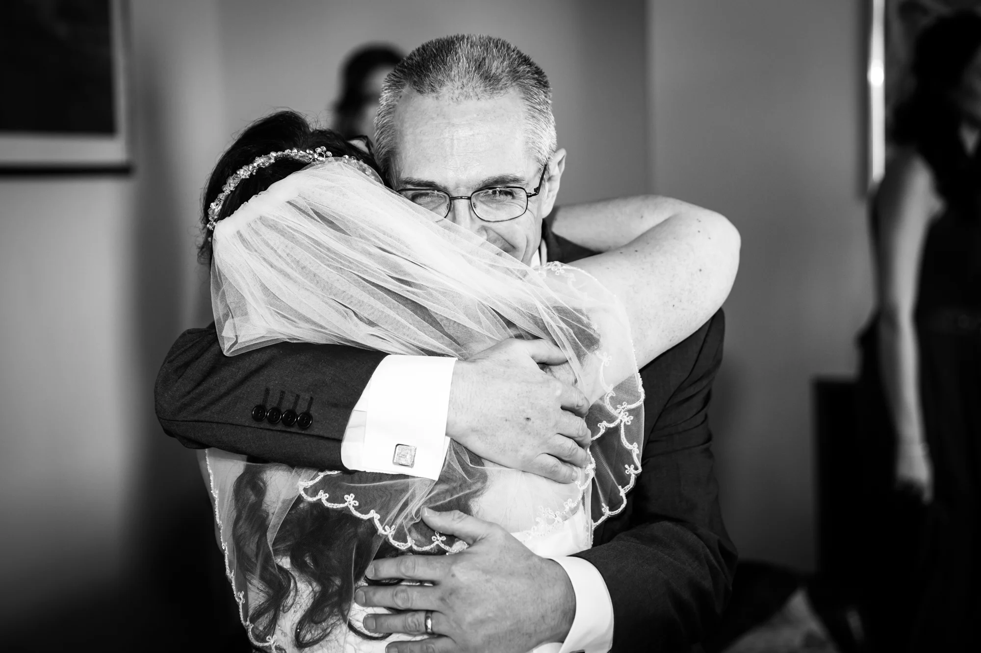 Once Jess had finished getting ready, I decided to position her in the dining room behind some large doors separating Jess from her family in the living room. This allowed me to position Jess’ Dad with his back to the doors so that once they were opened, all the family could see Jess except for Dad. This meant the anticipation for her Dad built up so that when he was finally allowed to turn around, I was able to perfectly capture his reaction.